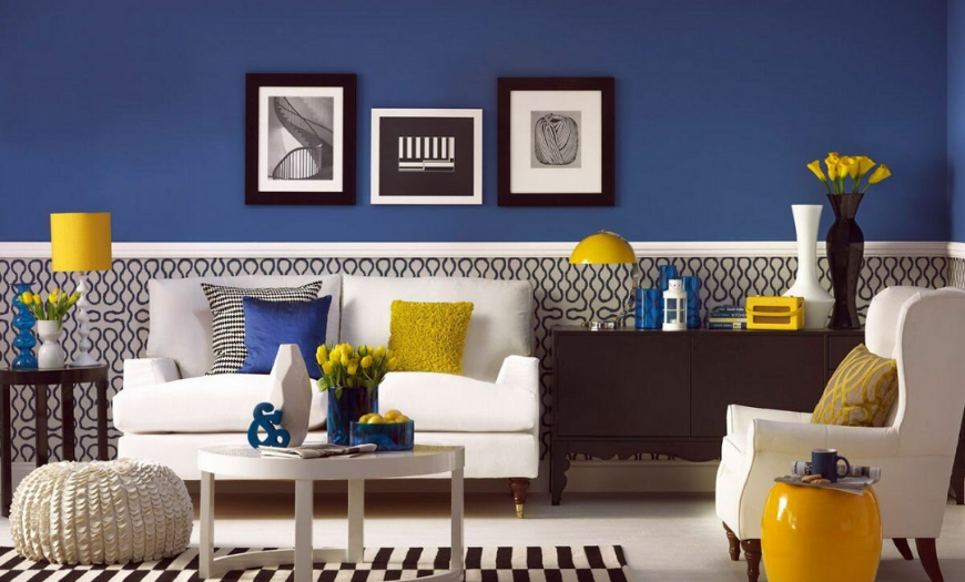 Классика – сочетание белого и насыщенного синего. Такой дуэт придает помещению роскошности, легкости, свежести. Неординарным личностям подойдет союз синего с солнечным желтым, который задает позитивное настроение. Комбинация с красным возможна, но смотрится экстравагантно.