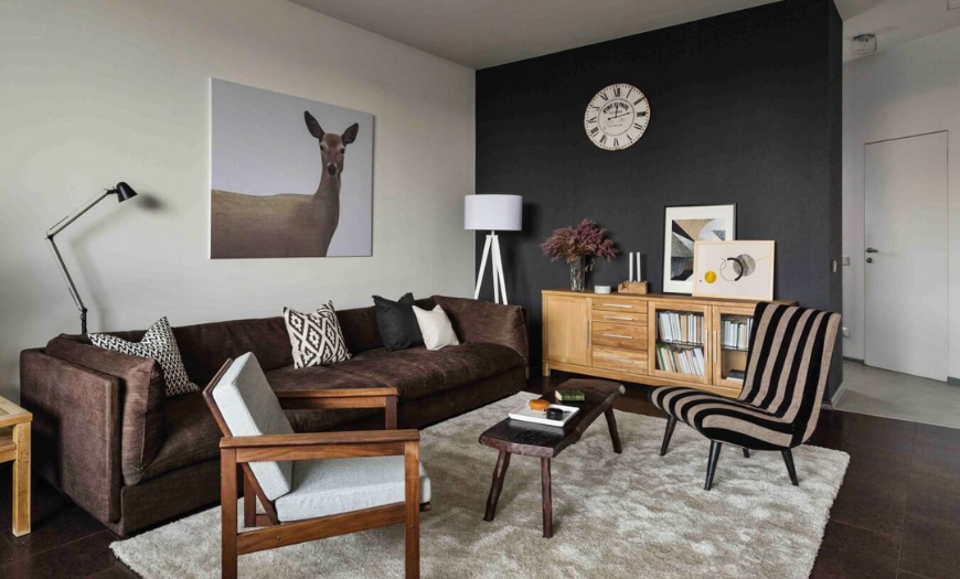 Для усиления акцентов в помещение добавляют несколько элементов белого или коричневого цветов.