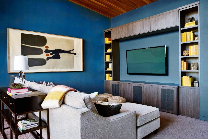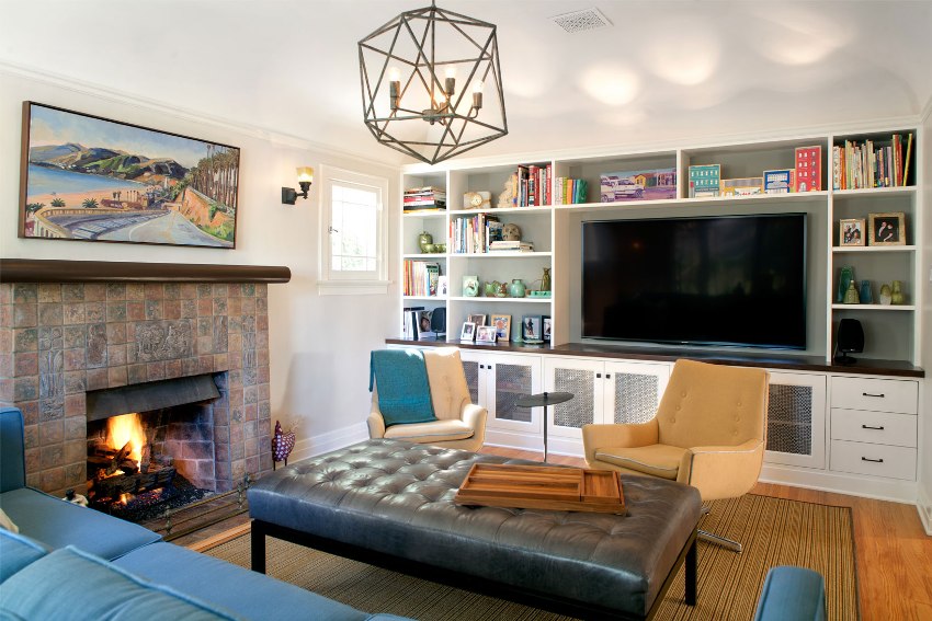 Самый массивный и громоздкий предмет следует размещать с противоположной стороны от важного и акцентного элемента (дивана и телевизора, дивана и камина).