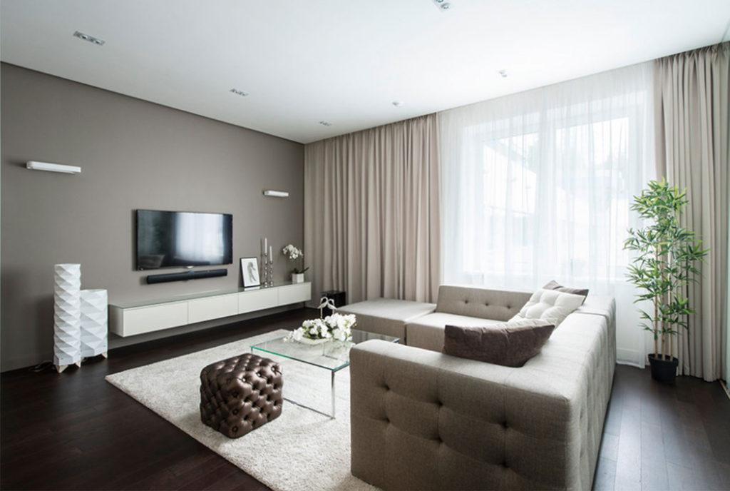 Оформить гостиную в современном стиле можно исходя из любых размеров комнаты, такая универсальность сделает небольшое пространство функциональным за счет четкости линий.