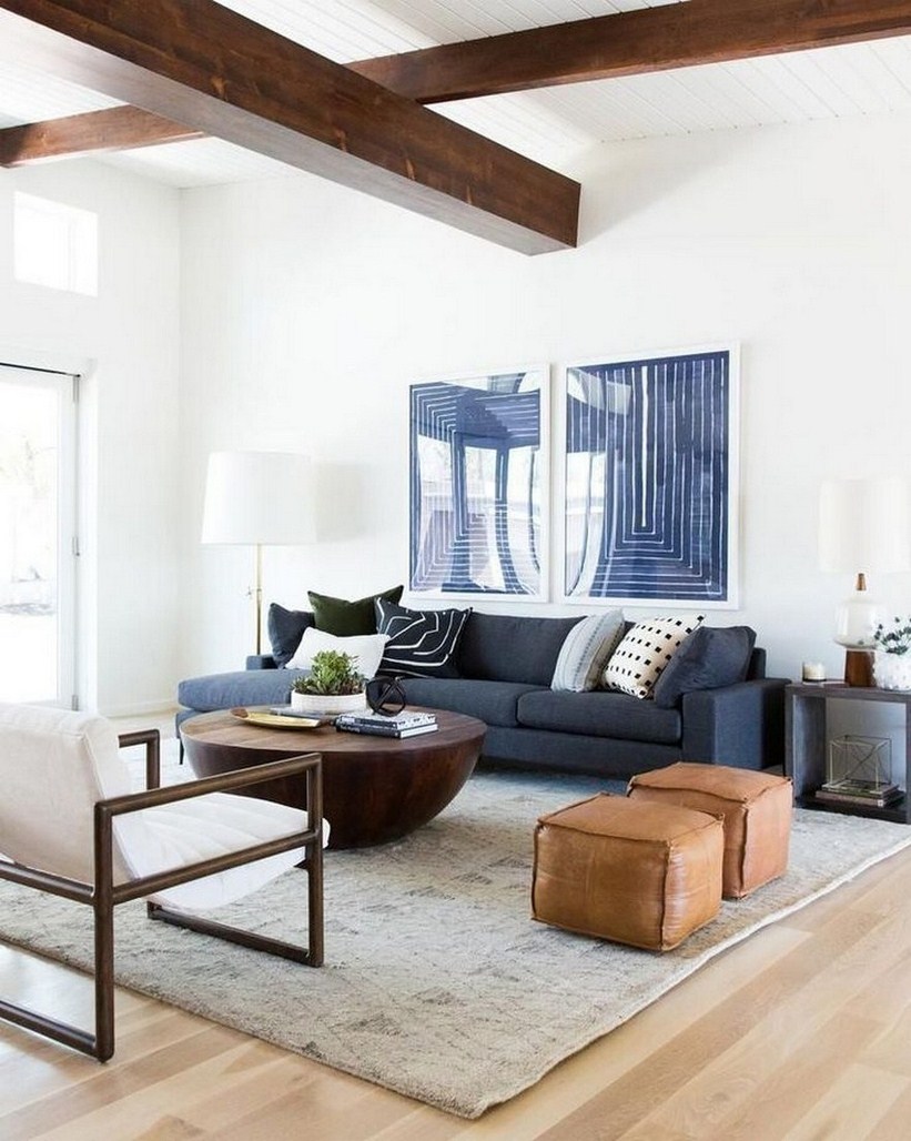 Из декора нужно обратить внимание на наличие зеркала, настенного декора (рамок и односложных картин), люстру простой конструкции, диванных подушек. Яркий или однотонный ковер и классические портьеры принесут тепло в современный интерьер. Текстиль в гостиной должен быть максимально естественным, и без наслаивания текстур