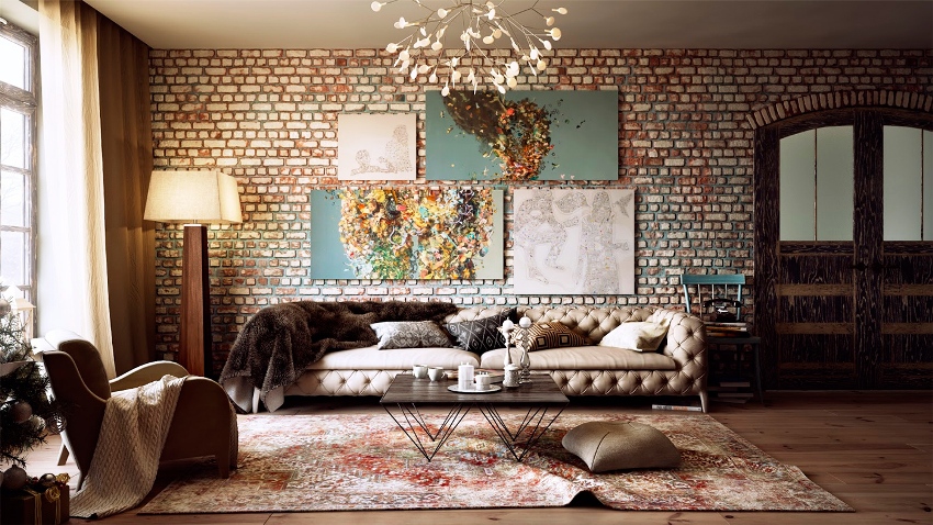 С яркими штрихами нужно быть осторожными, так как это будет вариация стиля. Ковер с северным орнаментом, бревна, рога оленя, керамические поделки и фото оживят пространство.