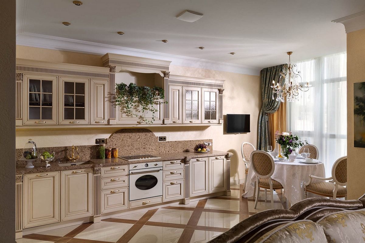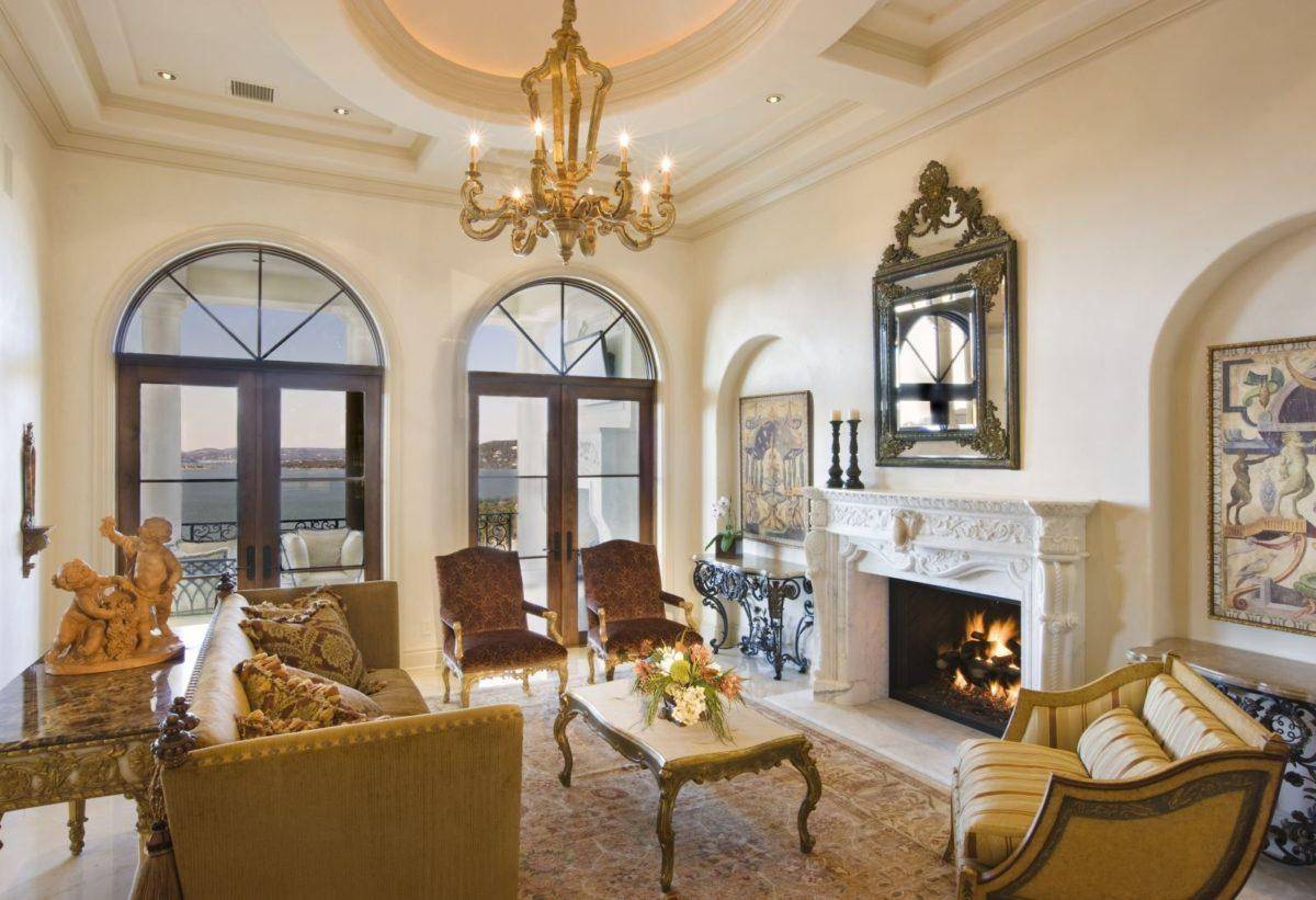 Все те же арки и высокие потолки, но цвета чаще светлые, без ярких акцентов, а еще добавляется показная роскошь: лепнина, зеркала в тяжелых рамах, классические картины, громоздкая мебель, металлические люстры с хрустальными элементами. Желательно скульптуры, статуэтки и фарфор, чтобы завершить картину.
