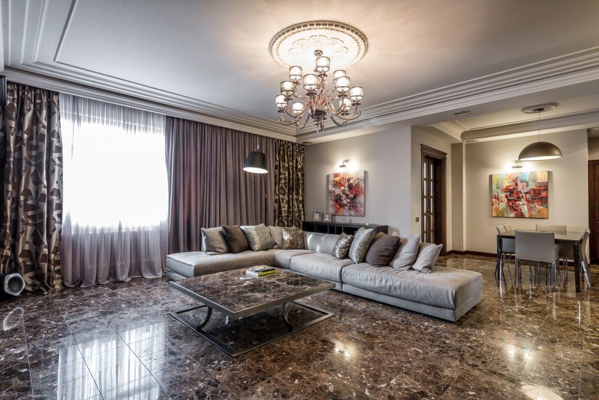 Дизайн квартиры в современном итальянском стиле позволяет заменять традиционные материалы более актуальными. На пол можно положить ламинат, а не паркет. На стены поклеить обои, а не покрывать их плиткой или штукатуркой. Потолки можно сделать натяжными (особенно если будет использоваться тканевый вариант).