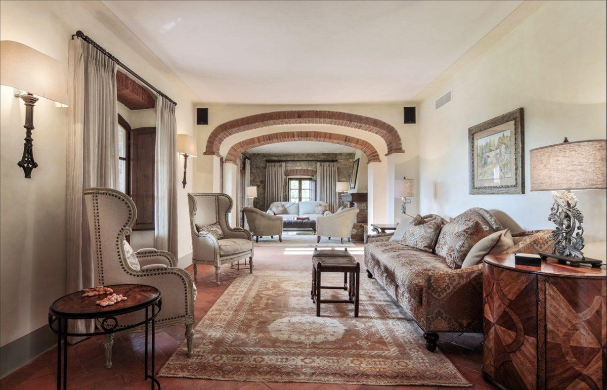 Стены штукатурят (обычно применяя технику состаривания), расписывают фресками или украшают лепниной. Балки не принято маскировать. Покрытием для пола служат плитка или натуральный камень (гранит, мрамор). Мебель тоже расписывают. Основными декоративными элементами гостиной в тосканском стиле служат вазы, наполненные фруктами, и другая посуда с росписями, а также кружева.