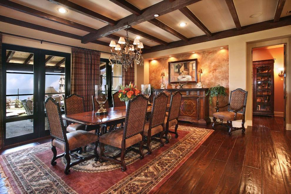 В гостиной тоже есть, где развернуться. Ее можно отделать камнем, но обычно все же предпочитают дерево. Паркет кладут на пол, красивые обои или штукатурку – на стены. В помещении много света, росписи, молочные, нежные оттенки в оформлении. Обязательно маленький диван, удобные кресла, торшер, а если позволяет бюджет — то и камин, и отделка под старину. Даже в деревенской разновидности допустимо немного роскоши, классика же и вовсе предполагает ее обязательное наличие.