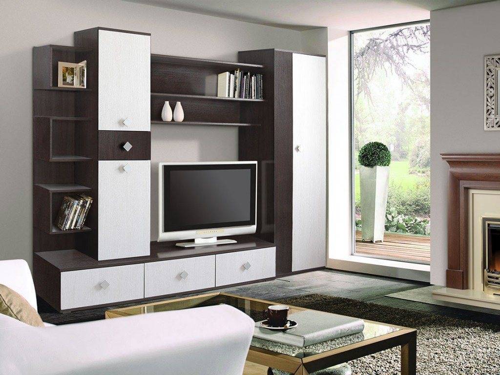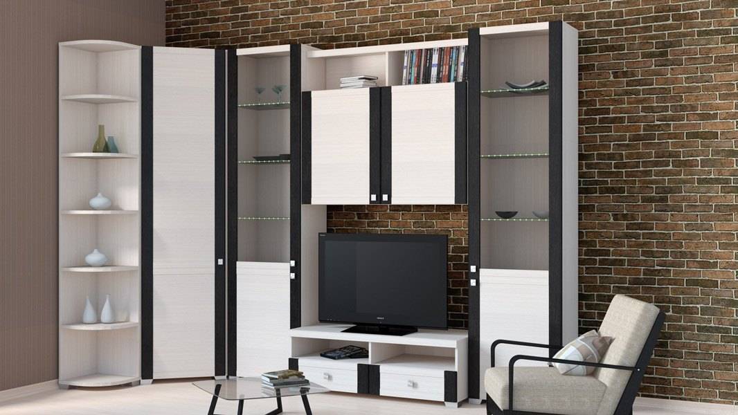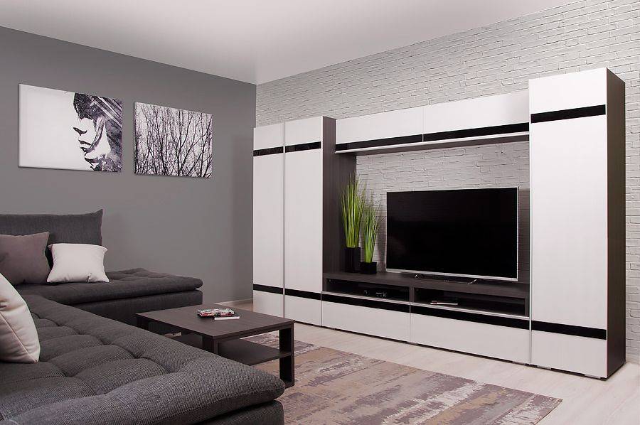 Традиционный элемент оформления зала – готовая стенка. Такой комплект включает шкафы для хранения вещей, и телевизионную стойку или отсек для телевизора, и полки.