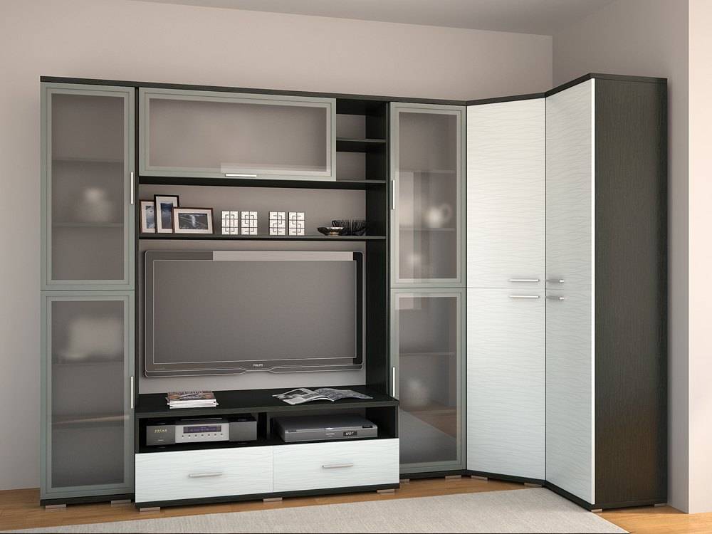 Размер и конфигурация стенки может быть разной. Чаще всего встречаются прямые стенки, их размещают вдоль длинной стены, что не всегда удачно с точки зрения интерьера. Угловые модели более интересны, поскольку позволяют, с одной стороны, использовать угол, а с другой – не изменяют пропорции комнаты.