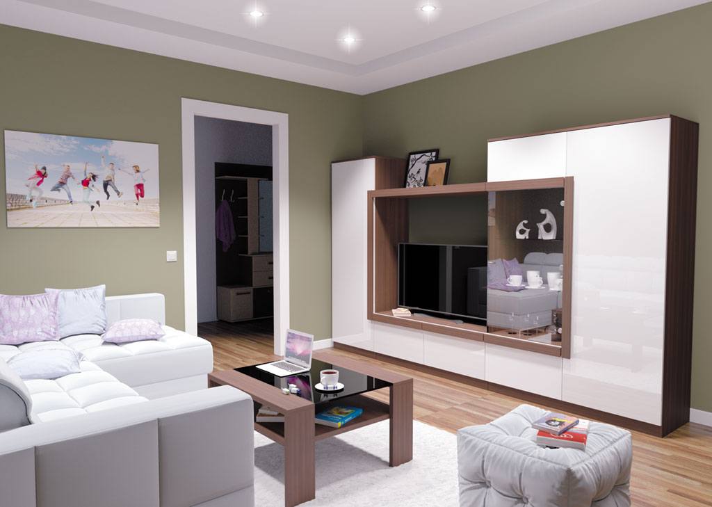 А вот если стены и потолок комнаты тоже оформлены белым, в зал дополнительная белая мебель (кроме стенки) не понадобится. В таких случаях последняя воспринимается как одна из базовых стен и не требует дополнения.