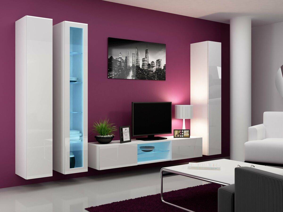 Современная корпусная мебель для гостиной не декорирована, ее очарование заключено в простоте. Единственным украшением является блеск. Здесь нет места для броского декора, лепнины, антиквариата, пушистых ковриков или кружева. Современная мебель для гостиной впечатляет своей формой и пропорциями. Здесь четко вырисовывается последовательность — простота видна в каждом элементе.