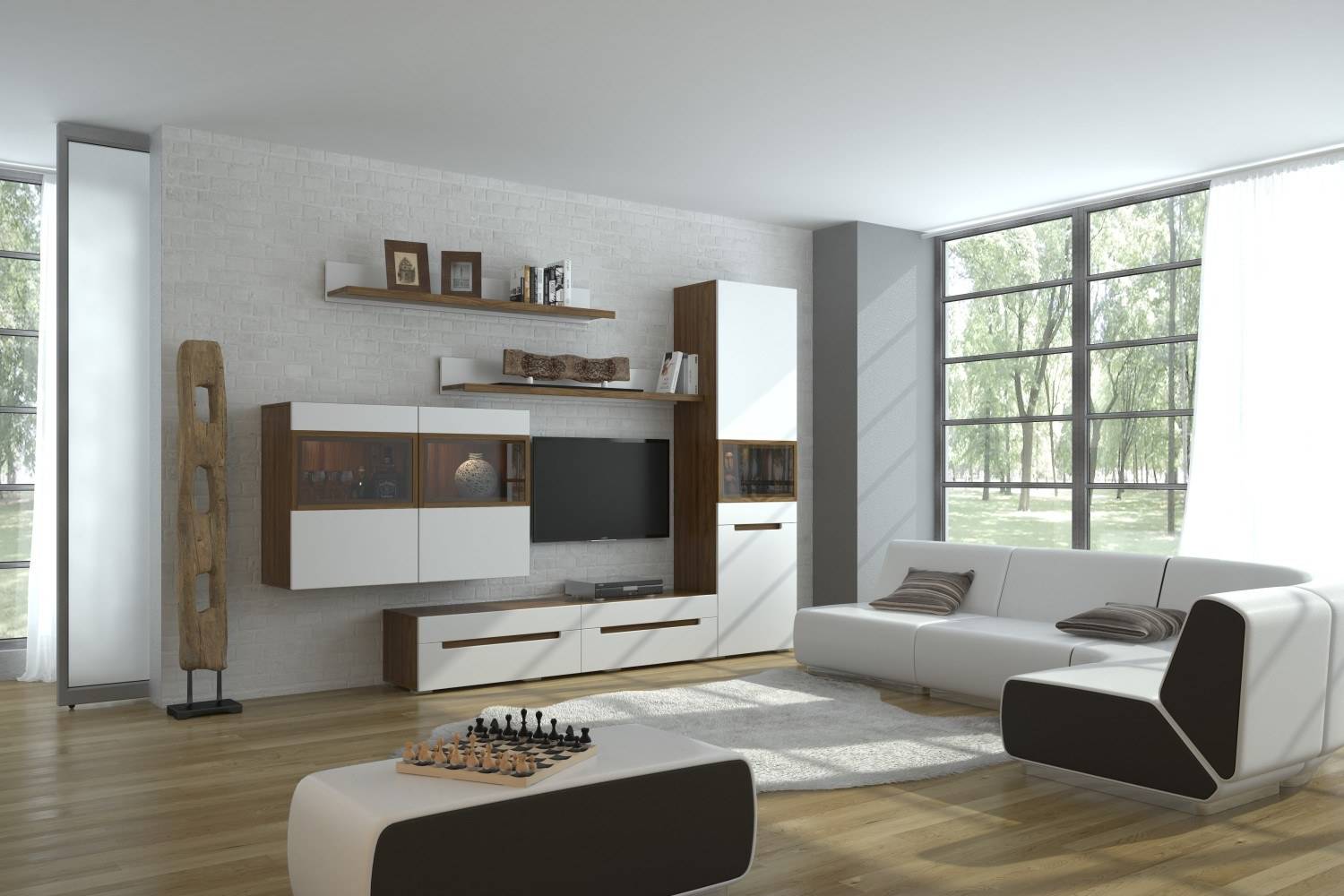 Современная мебель для гостиной прекрасно сочетается со сталью, стеклом, камнем, бетоном, кирпичом или экзотическим деревом. Данные материалы могут подчеркивать, как грубость, так и создавать более мягкое выражение. Черная мебель для гостиной прекрасно сочетается с белыми аксессуарами. И наоборот, белая мебель хорошо смотрится с черными декоративными элементами. Вместе они являются выражением современного дизайна.