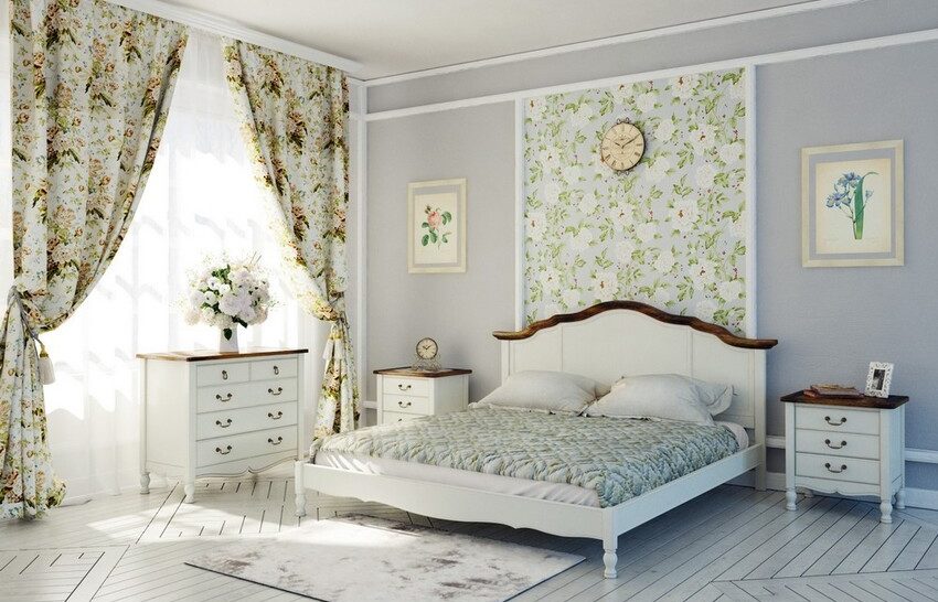 Спальня в стиле прованс — место, где обитают романтика и нежность. Отличительные черты — теплые пастельные оттенки, цветочные орнаменты, натуральные отделочные материалы, старинная или состаренная мебель, большое количество декора.
