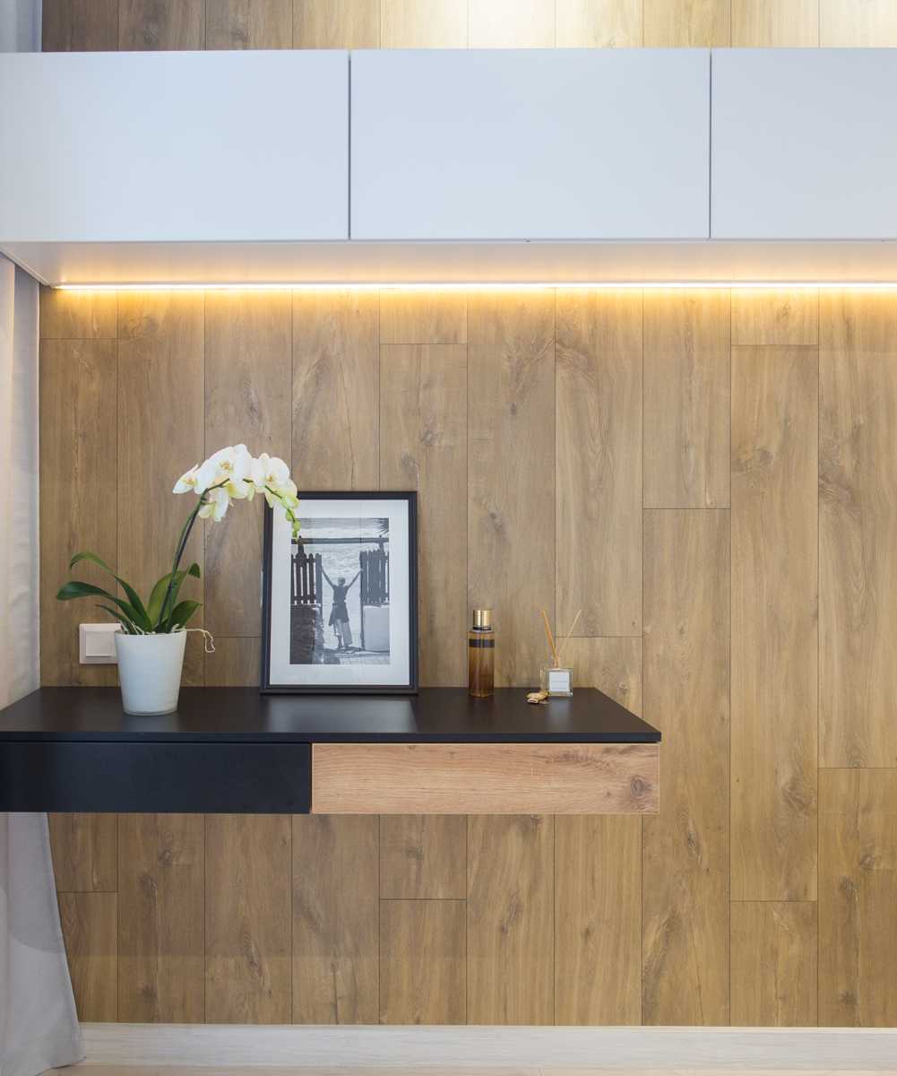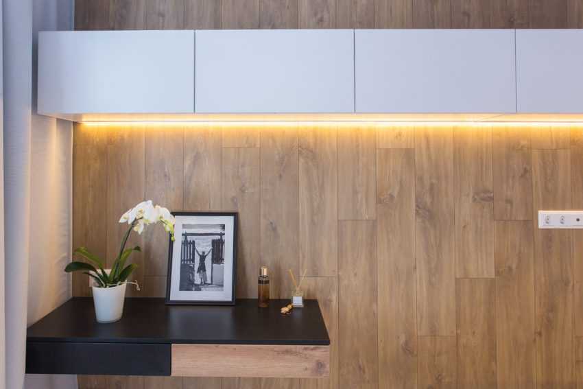 Текстура шпона полностью передает красоту и оригинальность рисунка древесины, а оценивается шпонированная стенка дешевле, чем деревянные аналоги.