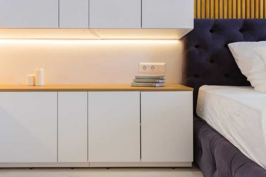 По-настоящему воздушным и невесомым видом, отличается парящая конструкция, состоящая из самых разнообразных элементов, например интересных шкафчиков, тумбочек или подвесных полочек. Подобные модели часто оснащаются подсветкой, что придает им еще больше легкости.