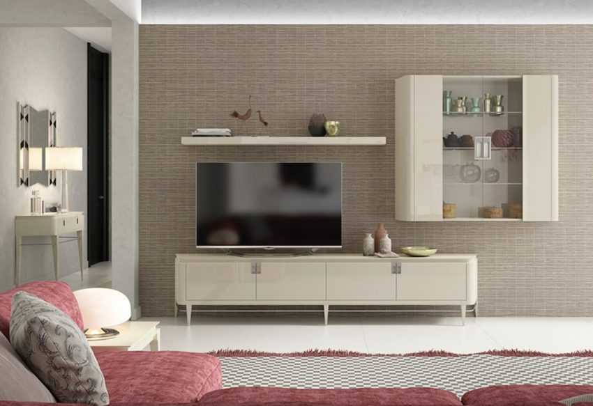 Минималистичный дизайн гостиной, предполагает использование более вместительных модулей в серых, бежевых или белых тонах. Фасады могут иметь матовое исполнение или быть декорированы стеклом, придающим конструкции больше легкости.