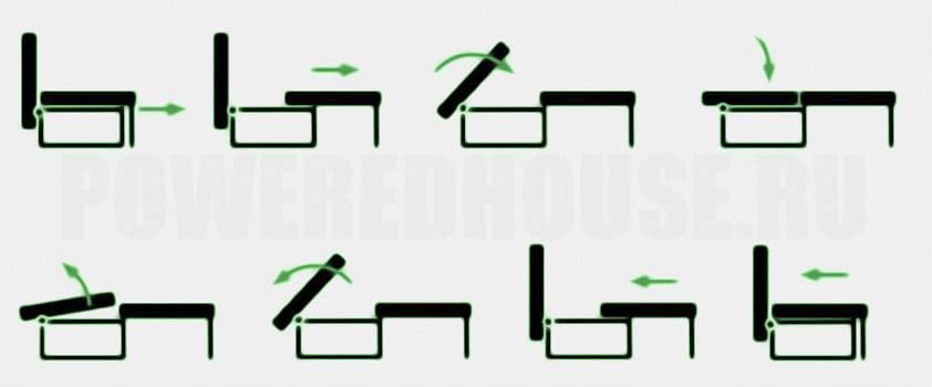 Для раскладывания этого механизма, нужно вытянуть нижнюю секцию. А для «заполнения» ниши нужно поднять секцию снизу за специальный ремешок. После таких действий появится ровная поверхность, которую можно использовать для сна. Такая конструкция в основном используется в угловых диванах.