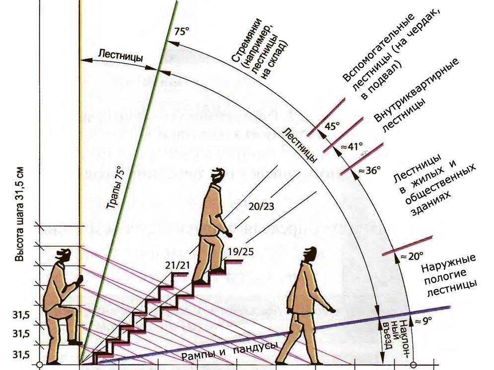 Необходимо правильно сделать расчеты угла наклона марша. Самым оптимальным является значение от 30 до 45 градусов. Если сделать угол меньше, вся конструкция будет занимать много места, если больше, то передвигаться по лестнице будет трудно и небезопасно.