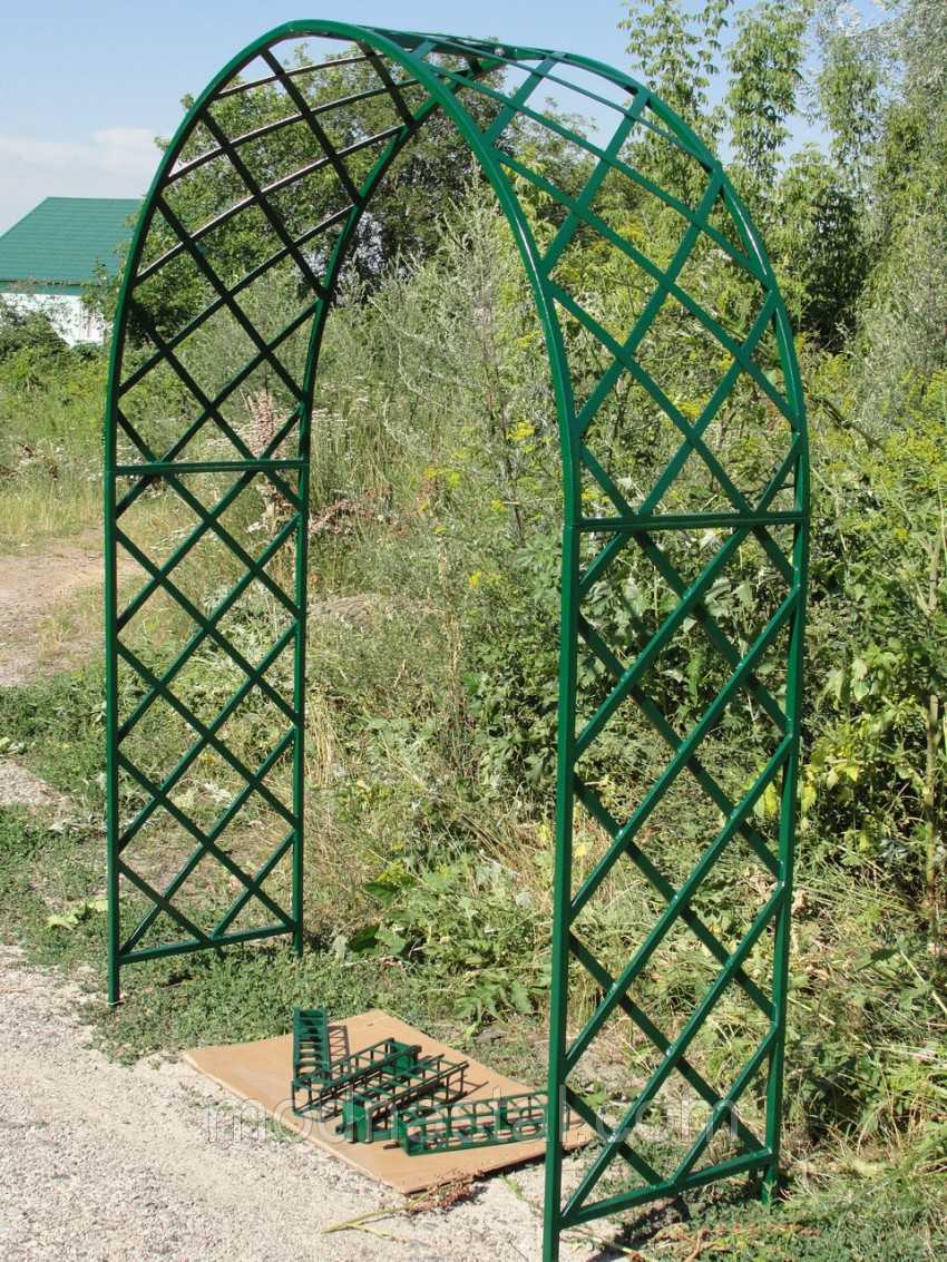 Осталось собрать все элементы арки: основание, стойки, два полукруглых верха, реечную решетку на боковых стенках и верхней части. Чтобы арку не снесло ветром, нужно закрепить основание с помощью анкеров или иным способом.