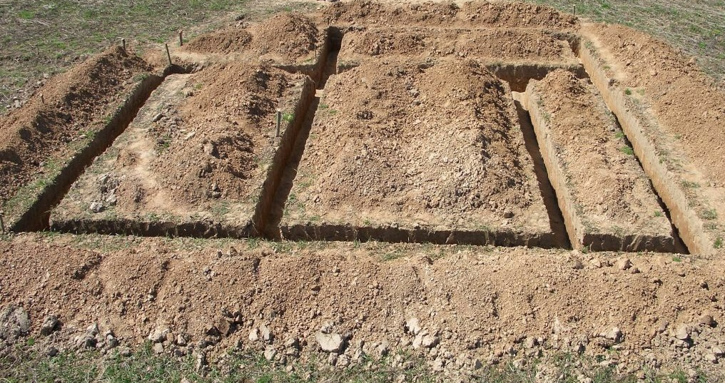 Натягиваем бечевку между колышками, после чего отступаем на расстояние в ширину фундамента и закрепляем еще четыре колышка по углам. Для песчаной почвы берется 40 см, для глинистой — 25 см. Далее происходит копание траншеи, глубина которой составляет примерно 50 см. Если в вашей конструкции предусмотрен простенок, под ним также нужно соорудить фундамент. На дно траншеи укладывается песок слоем в 10 см. Иногда применяют гравий, который необходимо разровнять и хорошо утрамбовать.