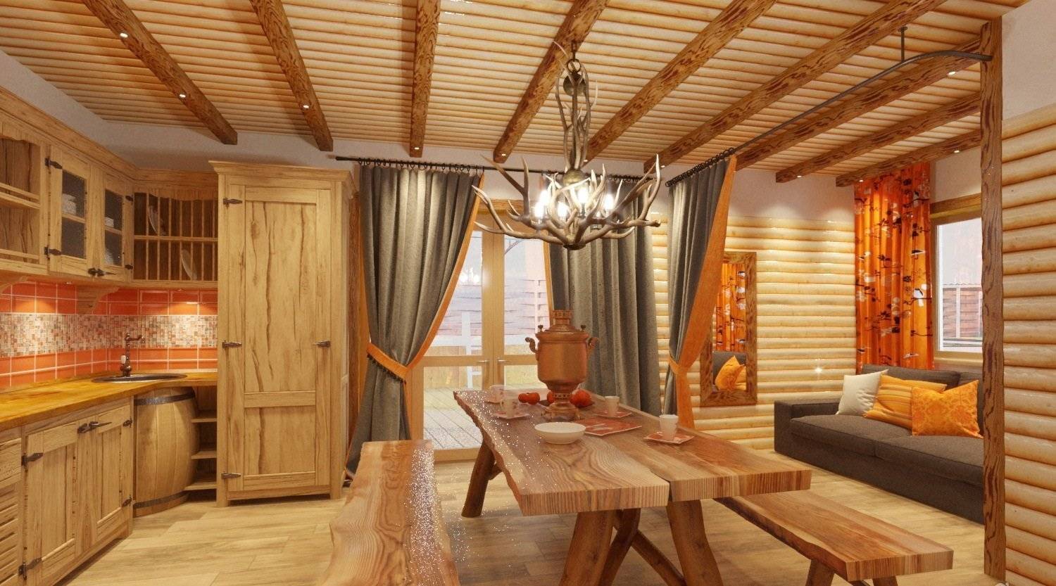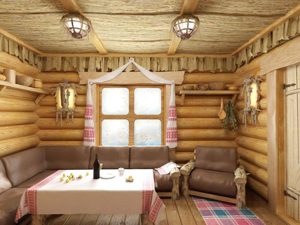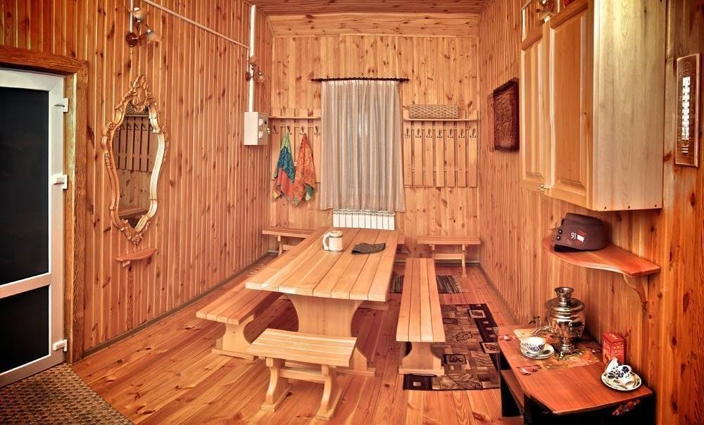 Деревянный стол, диван или мягкие кресла разместятся в комнате для отдыха. На стенах можно оборудовать полки для хранения посуды и аксессуаров для бани.