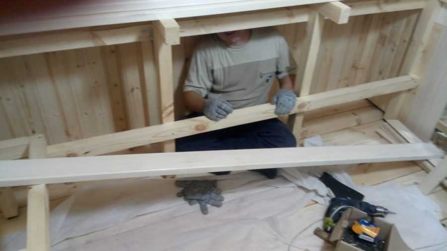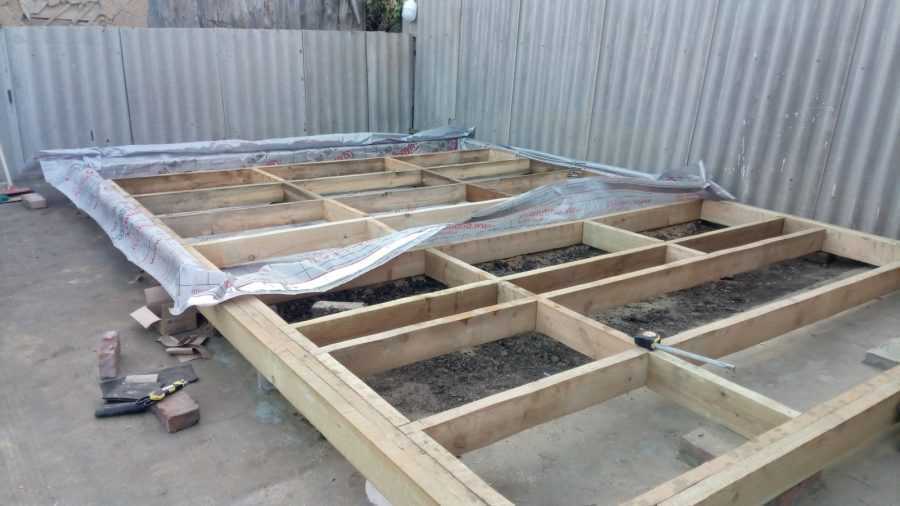 Хорошо утрамбовав землю внутри строения, ее укрывают гидробарьером, поверх которого насыпают керамзит. Затем укладываются лаги для будущих полов. Между лагами можно положить минеральную вату для утепления, сверху ее покрывают пленкой. Полы зашиваются досками, складывающимися вплотную. В помещении для парилки необходимо сделать уклон, по которому будет стекать вода в определенном месте. Если регион, где происходит строительство, не отличается холодной зимой, то полы можно не утеплять. Под парилкой пол заливается бетоном с определенным уклоном, чтобы сливалась вода, поверх прикрывается досками.