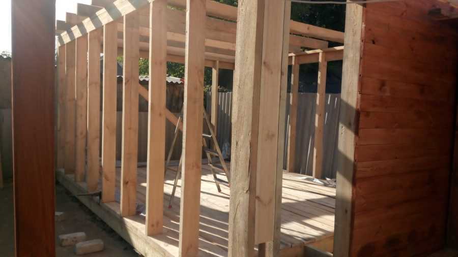 Шаг между стропилами делают согласно расчетам проекта. Для примыкающей, выступающей террасы, возводимой позже, устанавливают отдельно стропила, обрешётку под кровельное покрытие. Участок под пристройку планируют, выгораживают заранее.