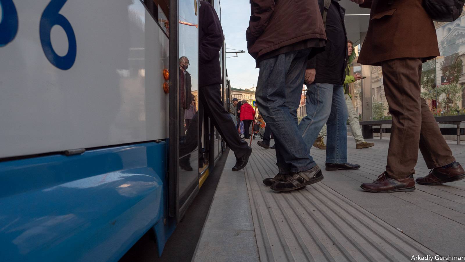 Транспорт абсолютно безбарьерный, для этого платформы выше тротуара и расширены в зоне остановки: