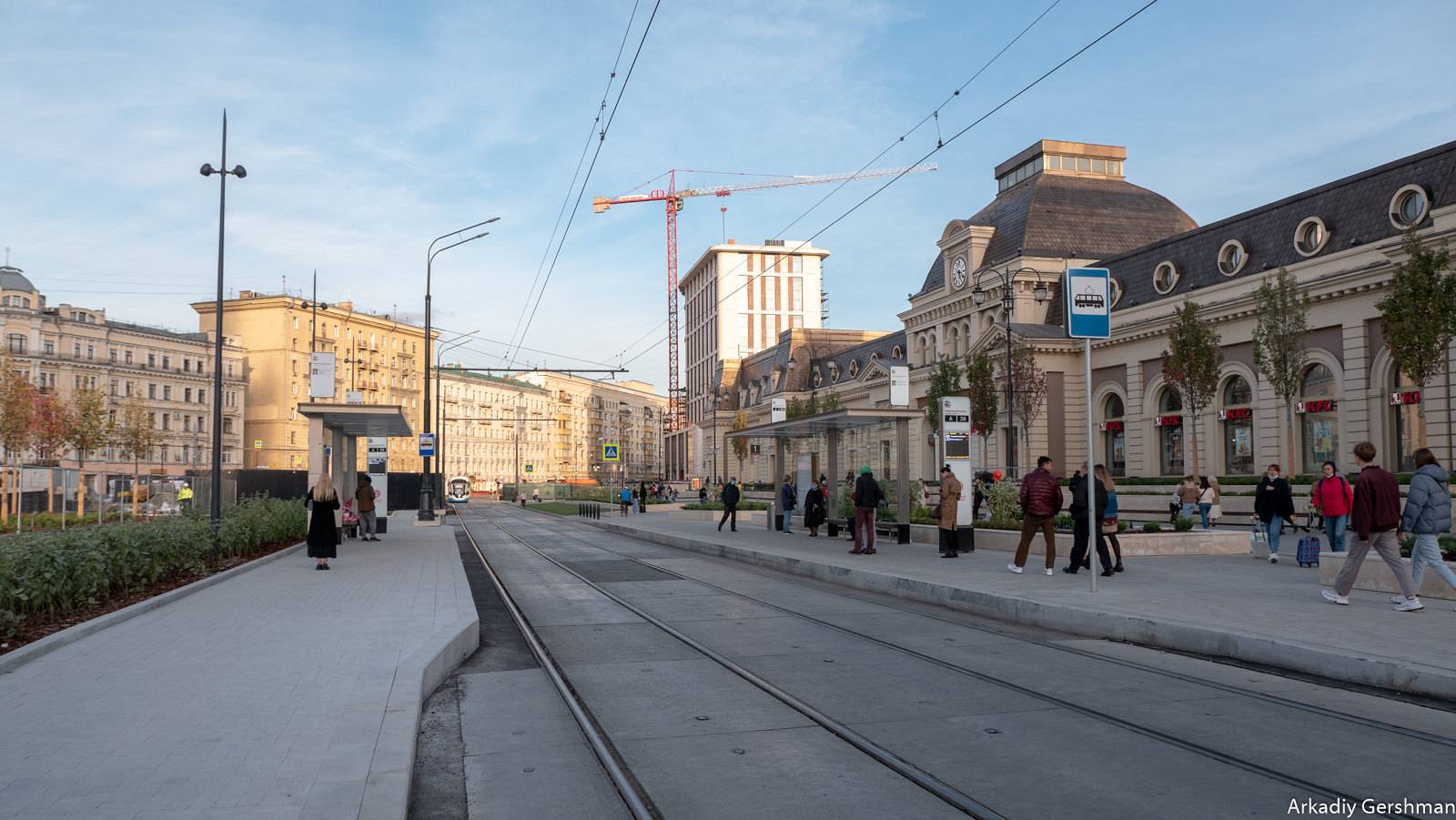 Это тоже часть истории, но про неё часто забывают: в 2020 году в рамках строительства ТРЦ здесь передвинули трамвай ближе ко входам вокзала. Вообще, это норма для любого развитого города с реальным приоритетом общественного транспорта: выходишь из здания вокзала, аэропорта или метро, и на первой линии будет трамвай или выделенка с автобусом, а уже после – стоянки такси, парковки и всё прочее.