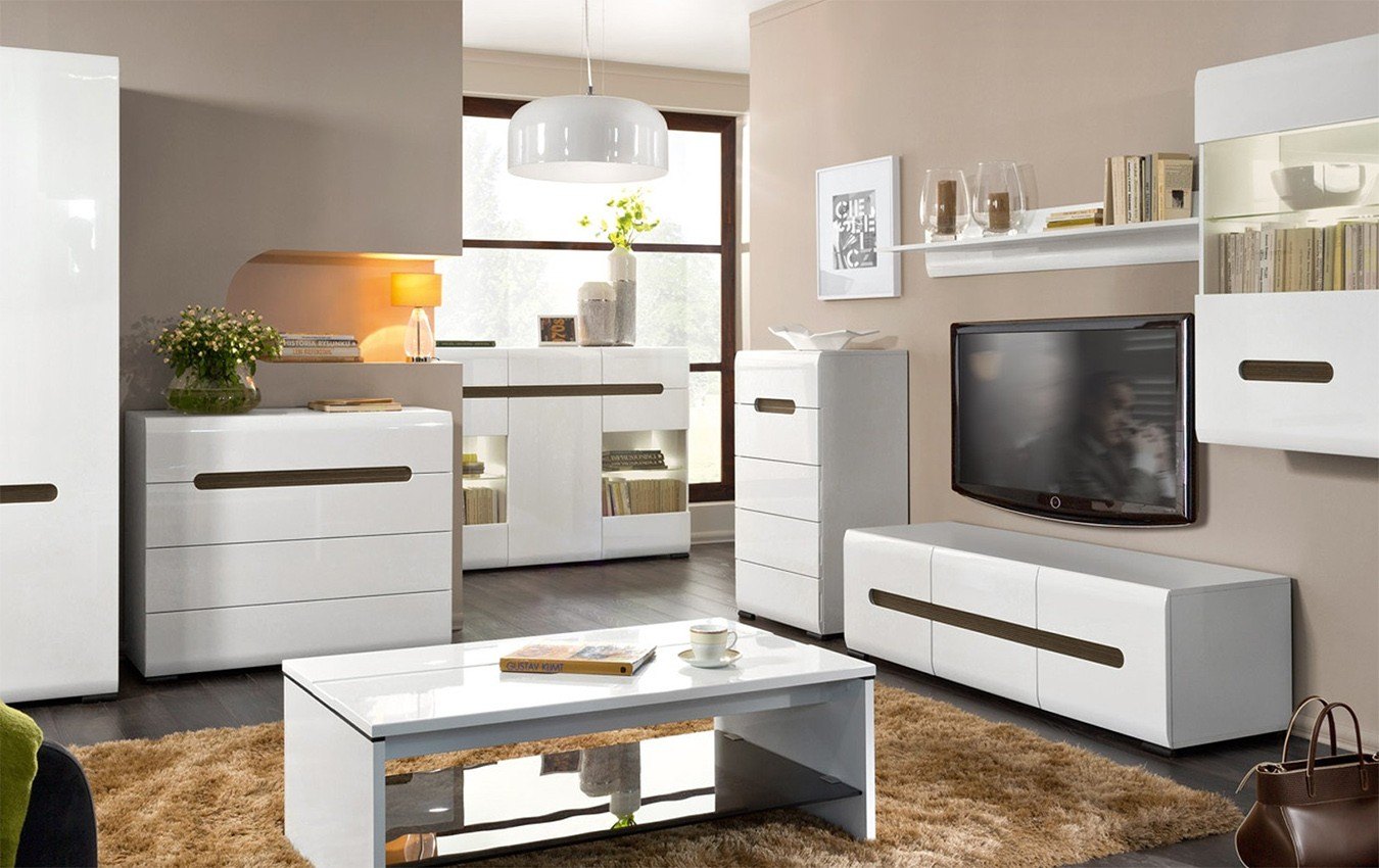 - Глянцевая белая стенка в гостиную – готовый набор из нескольких предметов, которые образуют собой единое целое. Главное достоинство – полная комплектация. Стенка включает закрытые и открытые секции, сектор для телевизора подходящего размера и прочее. Главный недостаток стенки глянец в гостиную – невозможность разъединить элементы и установить их в другом порядке.