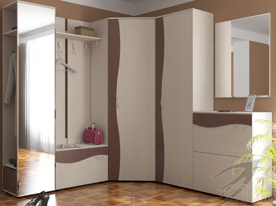 Угловая прихожая. Г-образное расположение предметов гарнитура позволяет оптимально рассредоточить шкафы, тумбочки и полки. Применяется для прихожих с недостатком квадратных метров.