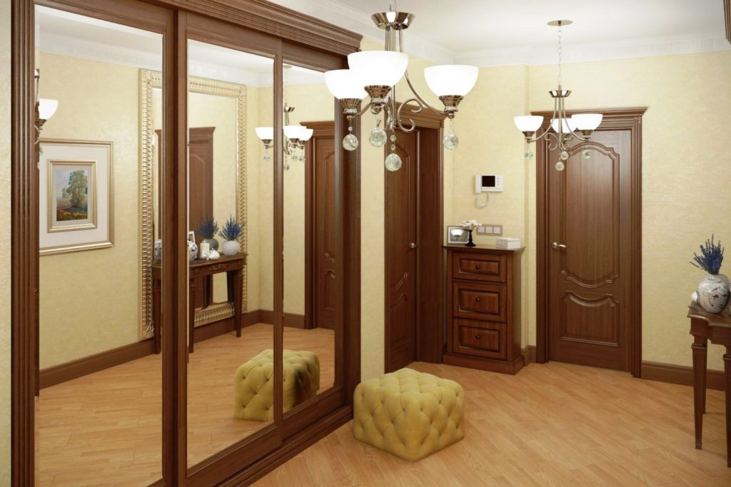 Шкаф-купе с зеркалами отлично впишется в такое пространство, помогая зрительно расширить пространство. Он сможет сделать из коридора квадрат, действуя на наше зрительное осязание.