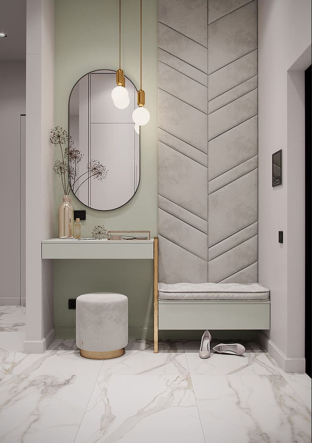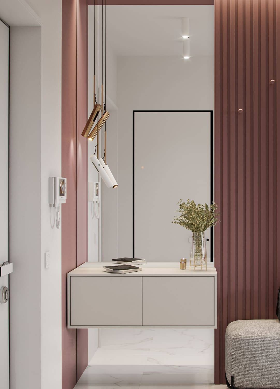 Прихожая — это место , где часто не хватает солнечного света, поэтому нужно хорошо позаботиться об искусственном аналоге.