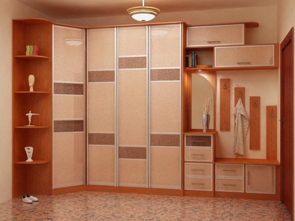 Угловая прихожая также может быть оснащена шкафом удобной и вместительной конструкции. В узких помещениях целесообразней ставить пеналы, дополненные отдельными полочками и вешалкой.
