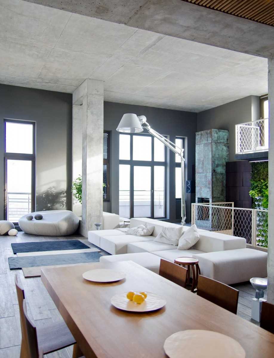 Серо-белый угловой диван в интерьере гостиной с элементами лофт