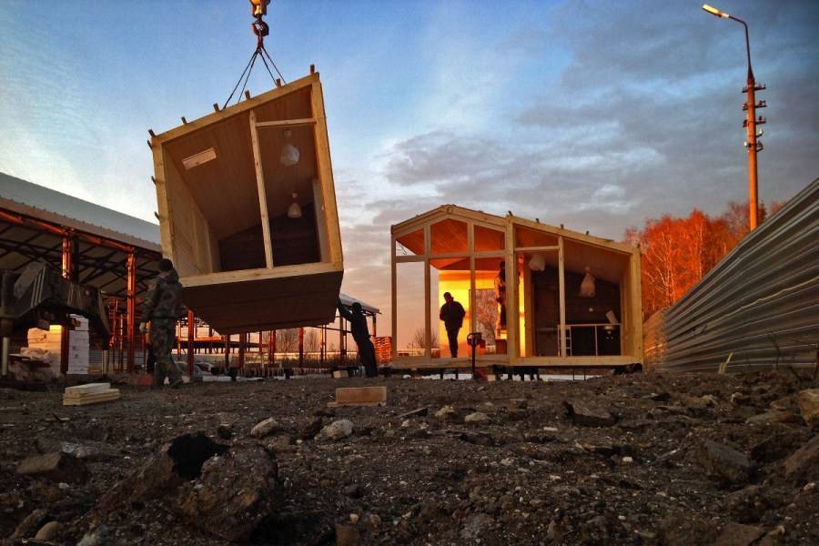 Цех сборки секций префабов (prefabricated housing — изготовление домов фабричным способом с последующей доставкой на место монтажа)