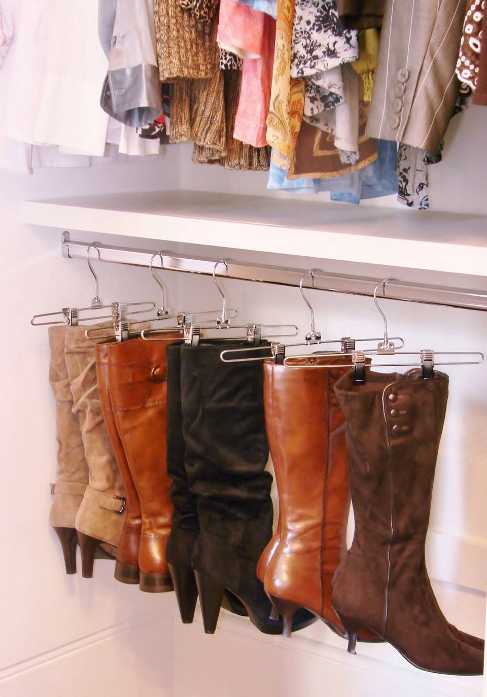 Вешалка для сапог. Для хранения высоких моделей сапог и другой высокой обуви существуют специальные приспособления. Оригинальную вешалку для сапог можно будет закрепить на балконе, с внутренней стороны шкафа, и, конечно, для устройства найдется уголок в гардеробной.