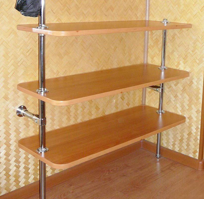 Можно изготовить полку для обуви из ДСП. Здесь целесообразно делать узкие или угловые модели, с прямыми либо закругленными торцами.