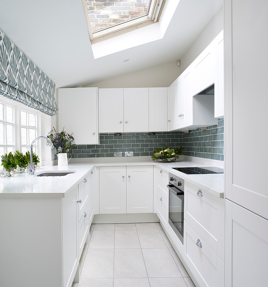 На фото интерьер кухни с накладной мойкой из искусственного камня светлого оттенка.