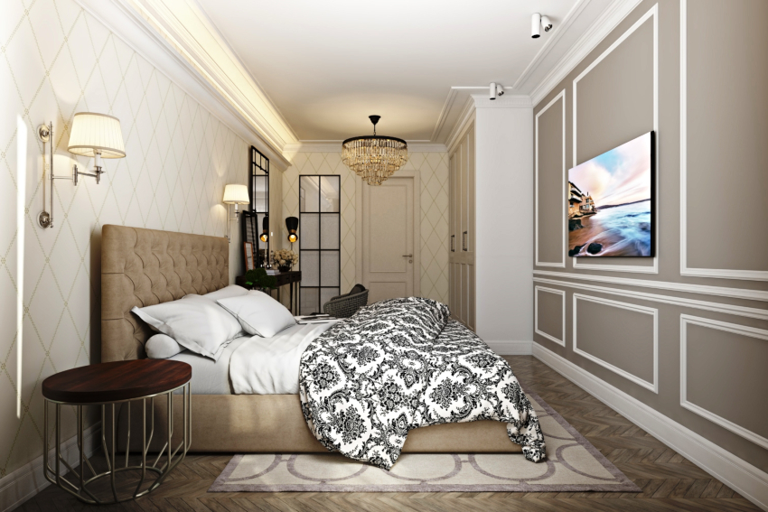 В маленьких спальнях отлично смотрятся узкие молдинги небольших размеров