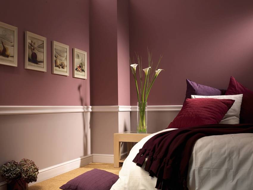 Хороший способ оригинально зонировать комнату. Он может объединить две разные фактуры обоев. В спальне отдается предпочтение более спокойным и нейтральным цветам. Горизонтально расположенный молдинг зрительно расширяет небольшое пространство спальни.