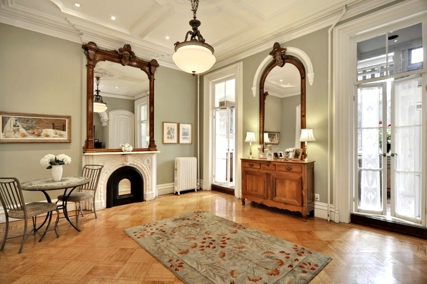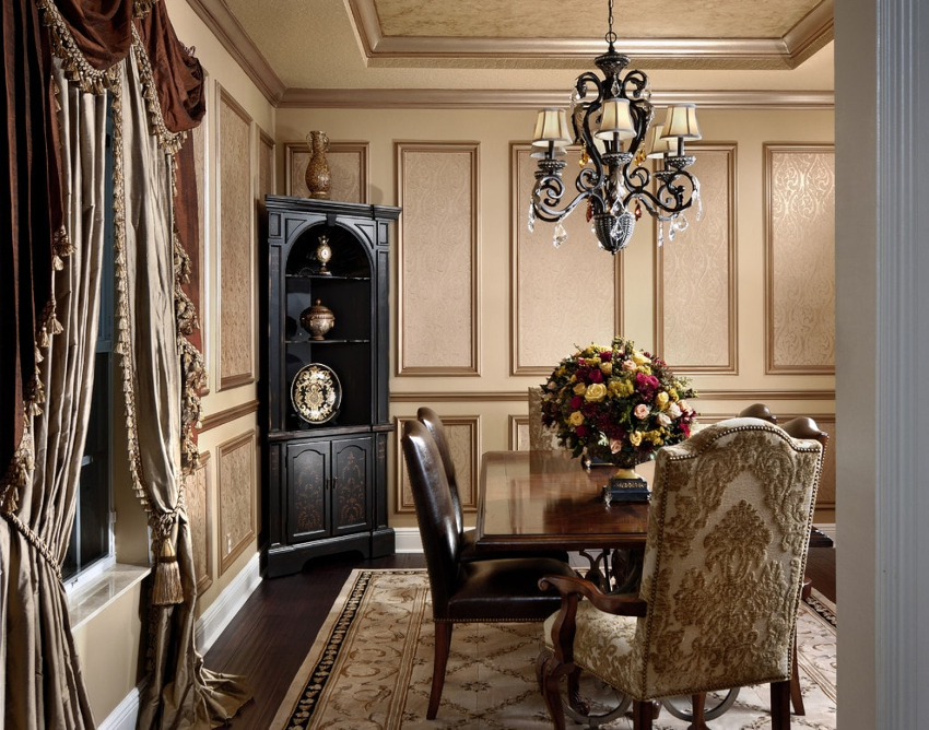 Интерьеры исторических стилей в гостиной, зачастую, это разделение стены по линии горизонта при помощи обоев разных оттенков, рисунка, текстуры. Накладные детали послужат линией разграничения, становясь частью полотна при помощи окрашивания в определенный цвет. Интересная идея — оформление полотен обоев при помощи молдингов для выделения квадратного или прямоугольного участка. Стильно/богемно/гламурно и со вкусом. Рассмотрите вариант драпировки определенной стены в помещении и обрамление определенного участка молдингом — и вы с легкостью создадите любой исторический стиль.