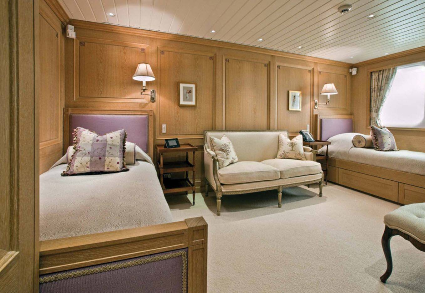 Еще один пример элегантного дизайна яхты. Интересно смотрится традиционная классика середины прошлого века. Используя произведения искусства и живые цветы, дизайнеры придают яхте живое ощущение. Смешивая минималистские и яркие элементы декора, помещение делается привлекательным и роскошным.
