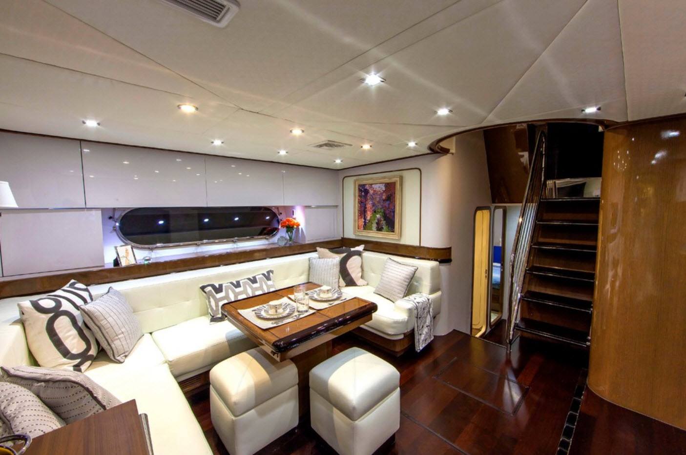 Яхту можно сделать воплощением элегантности, если взять ультралегкую цветовую гамму, акцентируя на привлекательные аксессуары и творческие навигационные детали. Сложная шикарная мебель еще более способствует элегантной эстетике, которая умело смешивает роскошные и минималистские дизайнерские решения. С первого или даже второго взгляда такой декор не выглядит как яхта, а скорее, как очень дорогой бутик-отель или квартира.