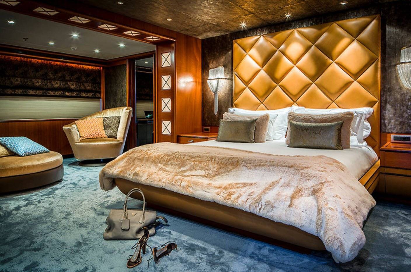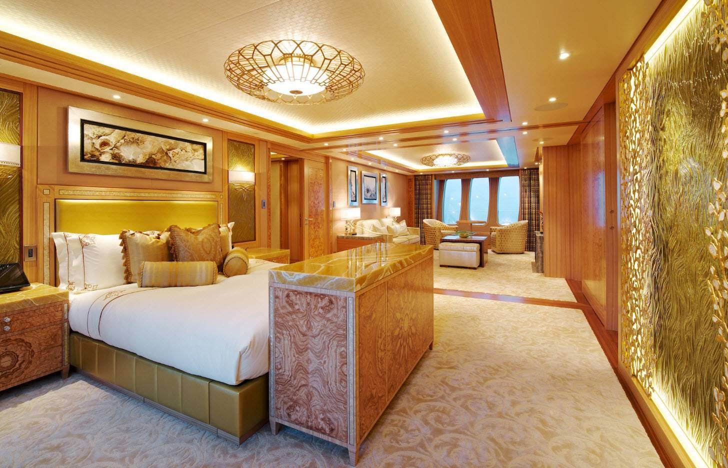 Такие интерьеры яхт являются одними из гламурных и роскошных, демонстрируя множество тем и влияний: от модерна и барокко до персидского и японского стиля. Богатые текстуры и материалы представлены повсюду, включая кожаные, каменные и темные леса, дополненные золотом, красным деревом и т.д. Одна из выдающихся особенностей интерьера — это широкая лестница из золотого металла.