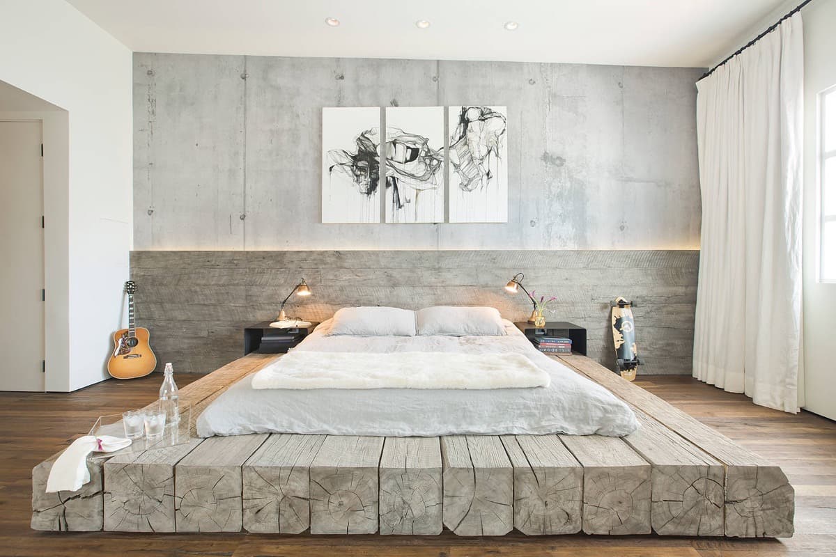 Традиционная отделка стен и потолка в спальне необработанным бетоном