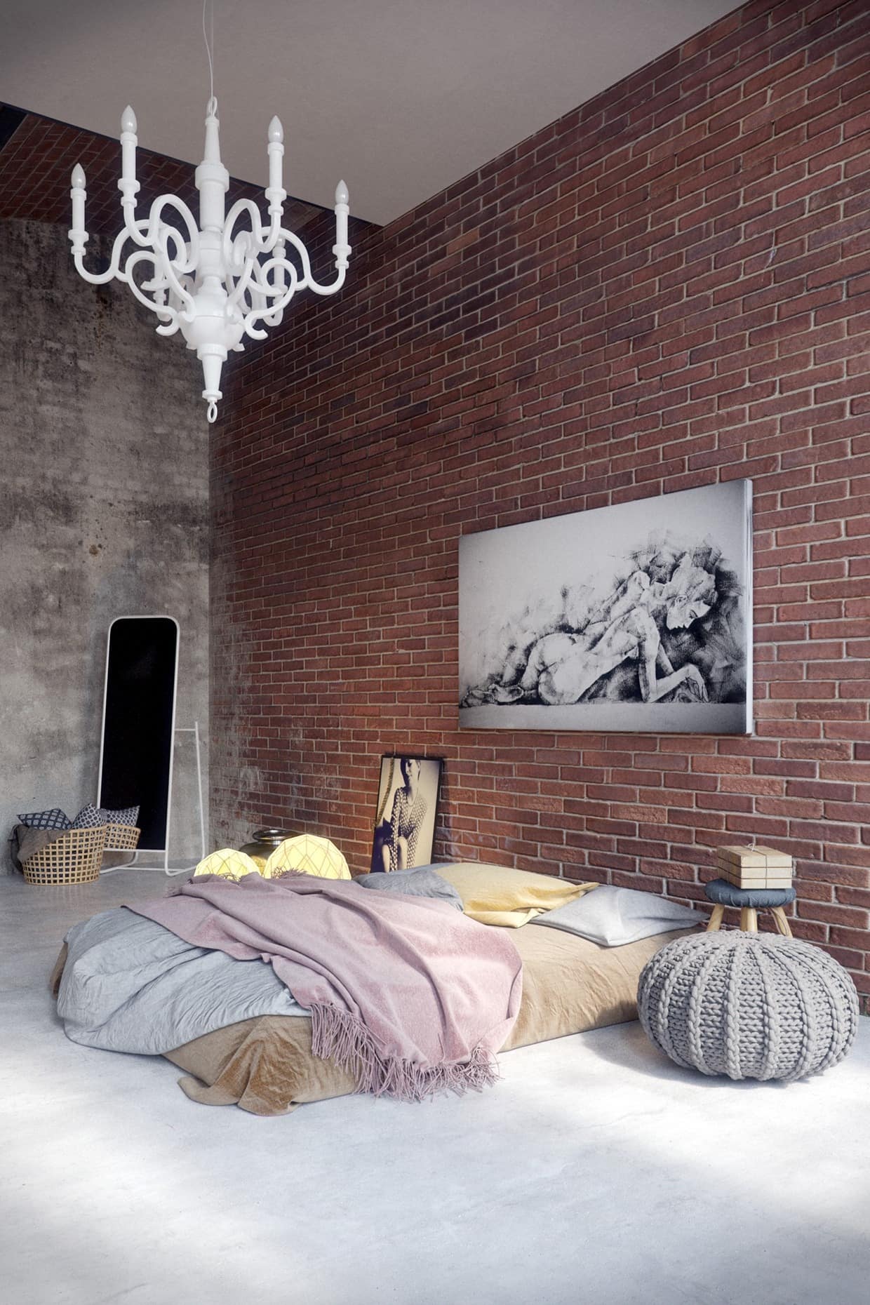 Мягкое теплое освещение придаст интерьеру спальни в лофт стиле особое настроение