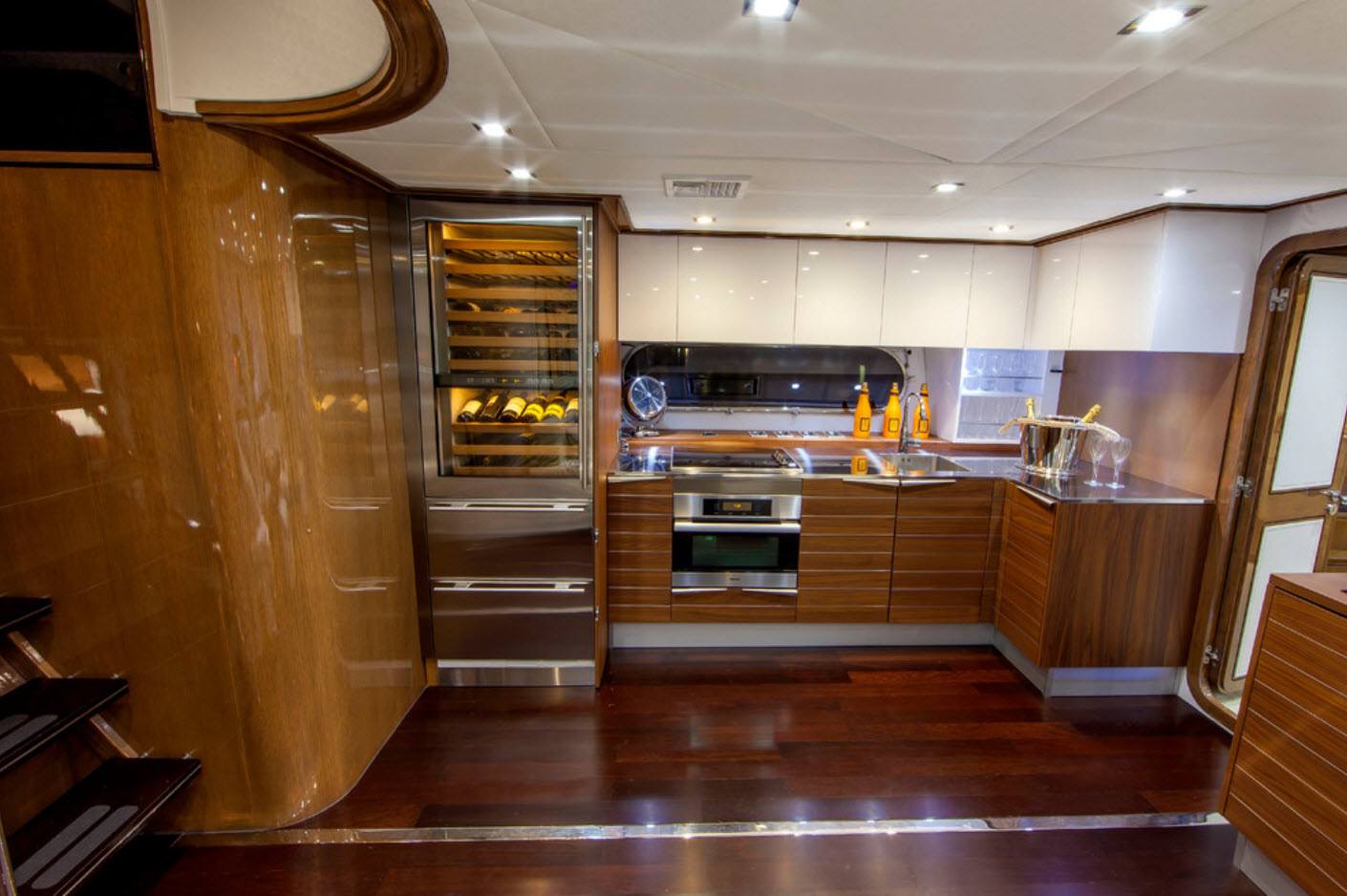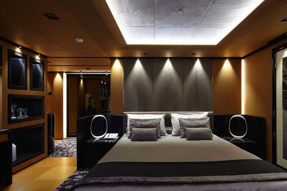 Ретро-футуризм в интерьере яхты можно создать благодаря деревянным панелям и серо-черным деталями. В других комнатах судна ретро-футуристическая эстетика сохраняется в сочетании с современными роскошными дизайнерскими решениями и материалами.
