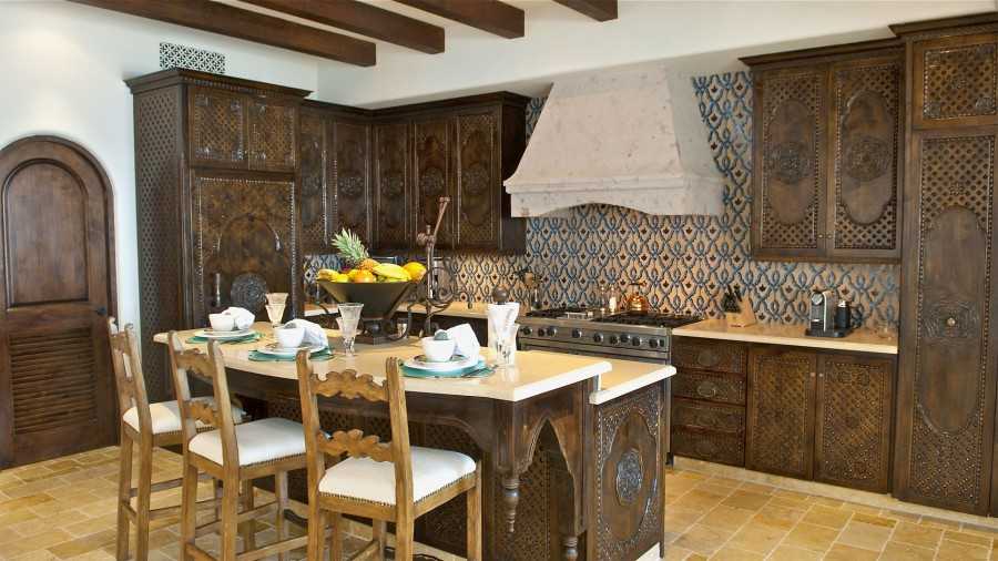 Для оформления мозаики в интерьере кухни в средиземноморском стиле характерно хаотичное расположение частей мозаики. Отлично смотрится не только мозаика с ровной поверхностью, но и мозаика, элементы которой имеют вогнутую поверхность.