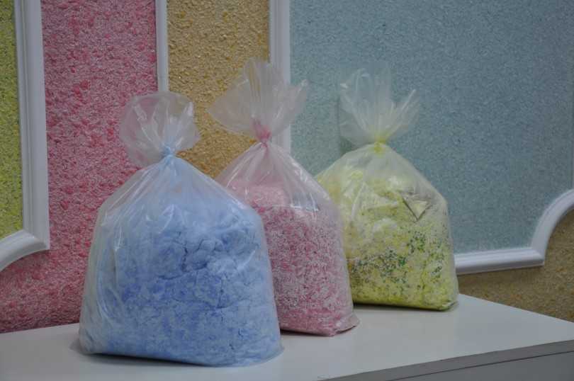 На полках магазинов, их можно встретить как пакеты с разноцветными опилками. Если подробнее — то эти опилки не что иное, как хлопковые и целлюлозные гранулы, красители и клей. Но кроме них в комплекте могут прилагаться нити, крошка и слюда различных ярких цветов. При размачивании, а после нанесении и высыхании, стены, окрашенные жидкими обоями, становятся мягкими, чуть шершавыми и даже теплыми.
