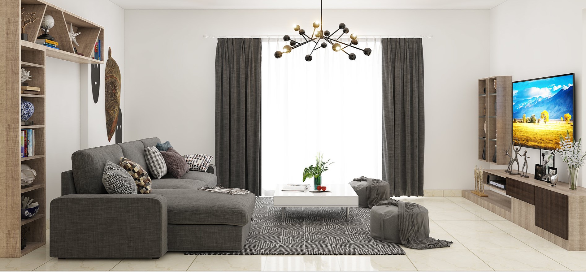 - Минимализм. Гостиная в таком стиле отличается лаконичностью, изысканной простотой. В комнате много света и свободного пространства. Мебели устанавливают мало (только самое необходимое), она чаще монохромная или выполнена в строгих классических расцветках (например, в серой, белой, черной, коричневой, бежевой). Четкие линии, правильные формы, почти полное отсутствие декоративных элементов, фурнитуры. Предпочтение отдается круглым, квадратным, прямоугольным предметам. Нередко мягкий гарнитур делают из кожи. Подходит для такого зала модульная мебель, трансформеры, встроенные шкафы.